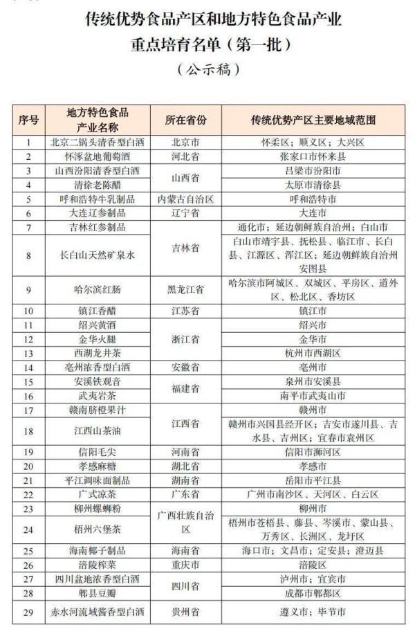 4月23日,工业和信息化部消费品工业司公示首批传统优势食品产区和地方特色食品产业重点培育名单,全国共40个产区(产业)入围。其中,有八省市区、21个市区县白酒产地入列首批大名单。