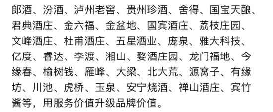 服务酒业部分品牌企业有:五粮液集团等一线名酒。还有