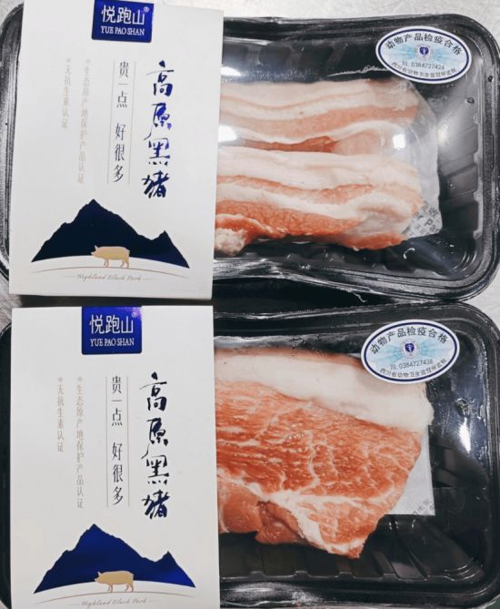 悦跑山·高原黑猪,同样源自川乡黑猪和乌金猪良种繁育血统,其中尤以选自海拔2000米以上的乌金猪为主,采用 “散养 + 舍饲” 模式,养足300天,肌肉纤维更细腻,肌间脂肪丰富有层次,拥有丰富的大理石花纹,其猪肉在呈味氨基酸含量、肌内脂肪含量、胆固醇含量、铁含量、维生素 B12 含量等指标上均明显优于普通猪肉,造就 “清水一煮就很香” 的独特风味。